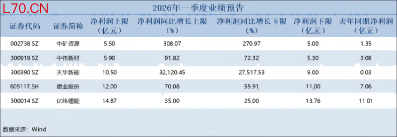 截至4月10日收盘,亿纬锂能(维权)(300014.SZ)、天华新能(300390.SZ)和中矿资源(002738.SZ)等5家锂电产业链企业已披露2026年一季度业绩预告,全部实现净利润同比增长。虽然盈利规模各有差异,但上游材料厂商的净利润增幅尤为显著,出现了数倍甚至几百倍的增长。