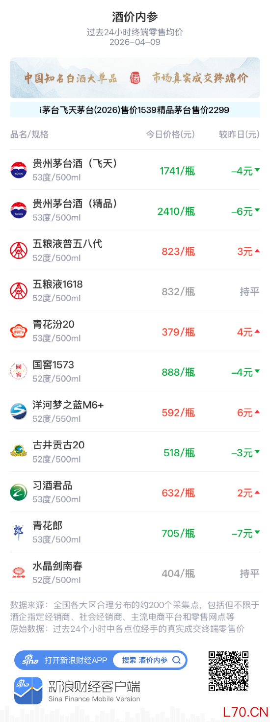 “酒价内参”每日数据源自全国各大区均有合理分布的约200个采集点,包括但不限于酒企指定经销商、社会经销商、电商平台和零售网点等,原始取样数据为过去24个小时各点位经手的真实成交终端零售价,力求为各界提供一份关于知名白酒市场价的客观、科学、全程可追溯数据。随着元旦官方i茅台平台开售1499元/瓶的飞天茅台(3月31日凌晨上调至1539元/瓶),1月9日开售2299元/瓶的精品茅台,这一新渠道对两款产品终端零售均价的磁吸式影响力逐步显现。“酒价内参”每日发布的酒价遵循对真实成交量加权的计算规则,我们已将可确量的价格引入两种酒品终端零售价的计算中。