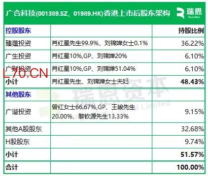 招股书显示,广合科技在香港上市前的股东架构中,肖红星先生、刘锦婵女士夫妇合计持股48.43%,为控股股东。广谐和投资(曾红女士66.67%,GP、王峻先生20.00%、黎钦源先生13.33%),持股9.15%;其他A股股东持股32.68%;H股股东持股9.74%。