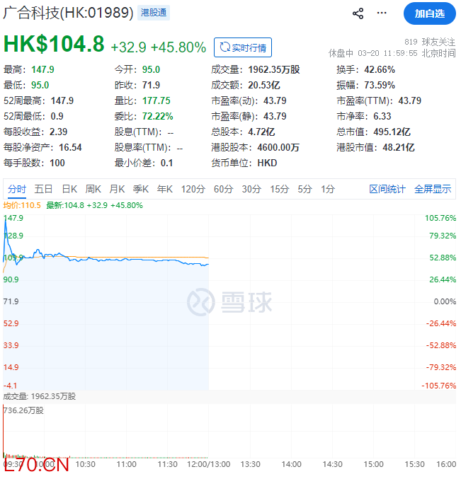 截至午间收市,广合科技每股收报104.80港元,涨45.80%,目前总市值约495.12亿港元。