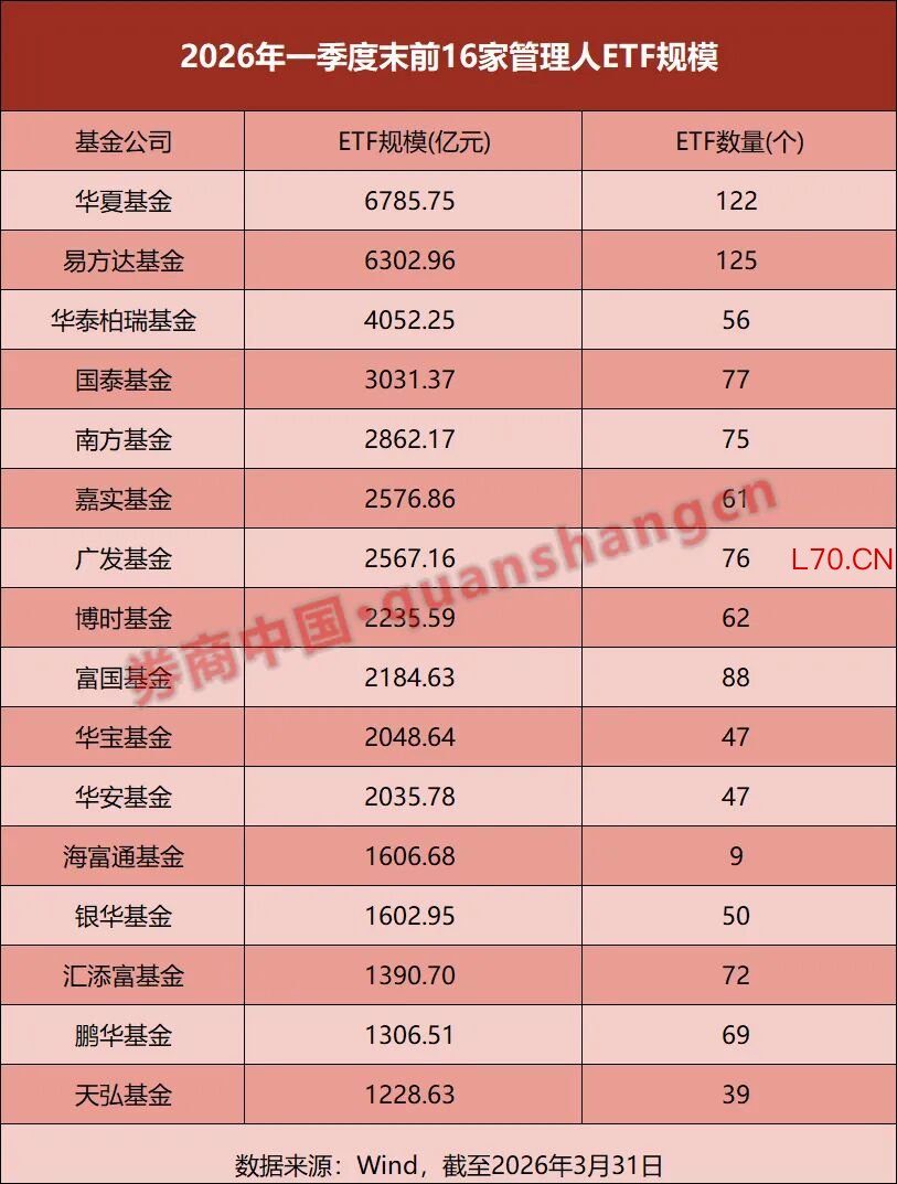 Wind数据显示,截至2026年3月31日,华夏基金以6785.75亿元的ETF规模继续稳居行业第一,旗下产品数量达122只;易方达基金紧随其后,规模6302.96亿元,产品125只;华泰柏瑞基金凭借4052.25亿元的规模位列第三,产品数量56只;国泰基金和南方基金分别以3031.37亿元和2862.17亿元跻身前五。嘉实、广发、博时、富国、华宝、华安等公司ETF规模均超过2000亿元。合计共16家公司ETF规模超过千亿元。