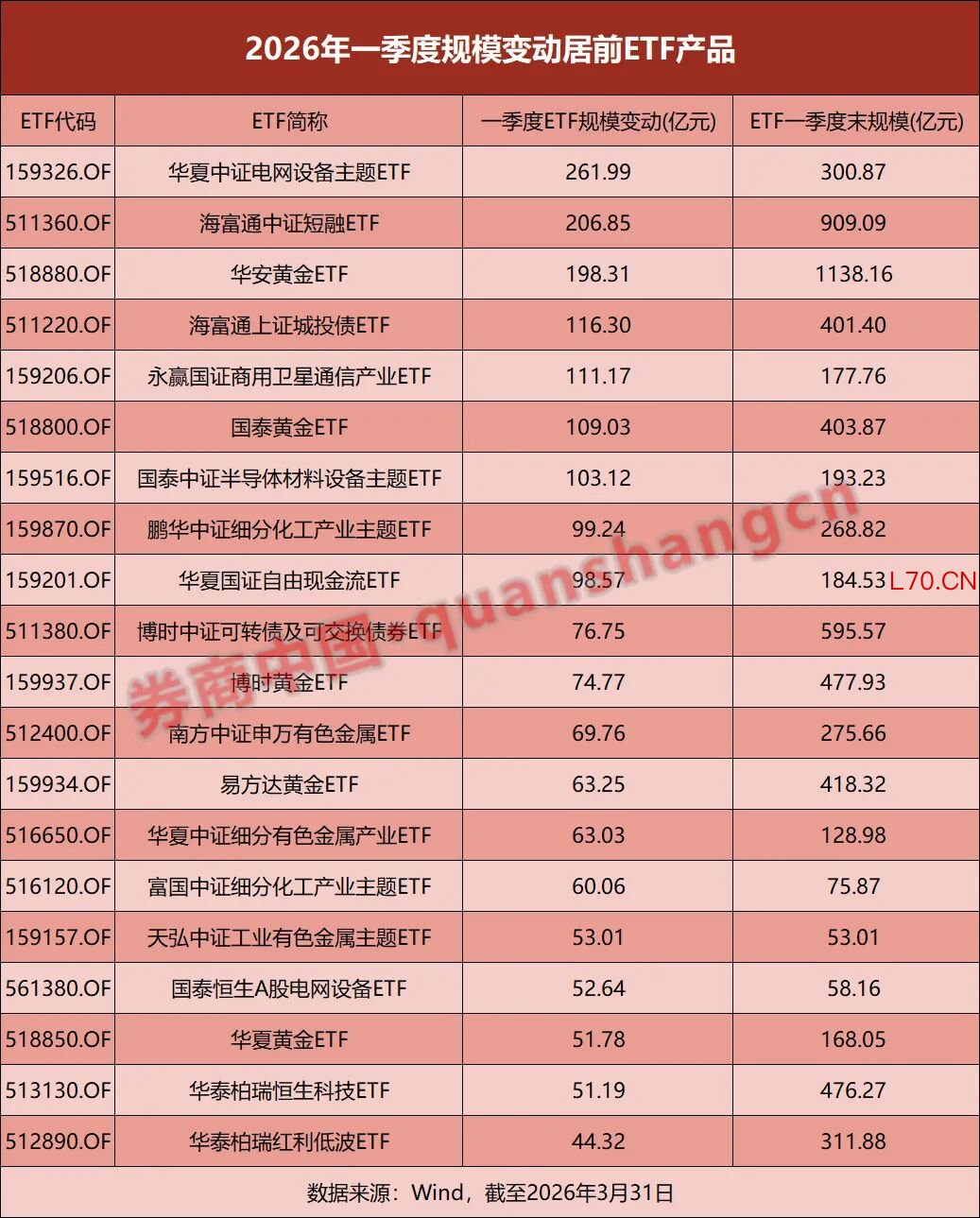 从单只产品来看,一季度共有两只ETF规模增长超过200亿元。其中,华夏中证电网设备主题ETF以261.99亿元的增量领跑全市场,季末规模达300.87亿元;海富通中证短融ETF紧随其后,增长206.85亿元,总规模突破900亿元。另有华安黄金ETF、海富通上证城投债ETF、永赢国证商用卫星通信产业ETF等5只产品规模增长超百亿元。
